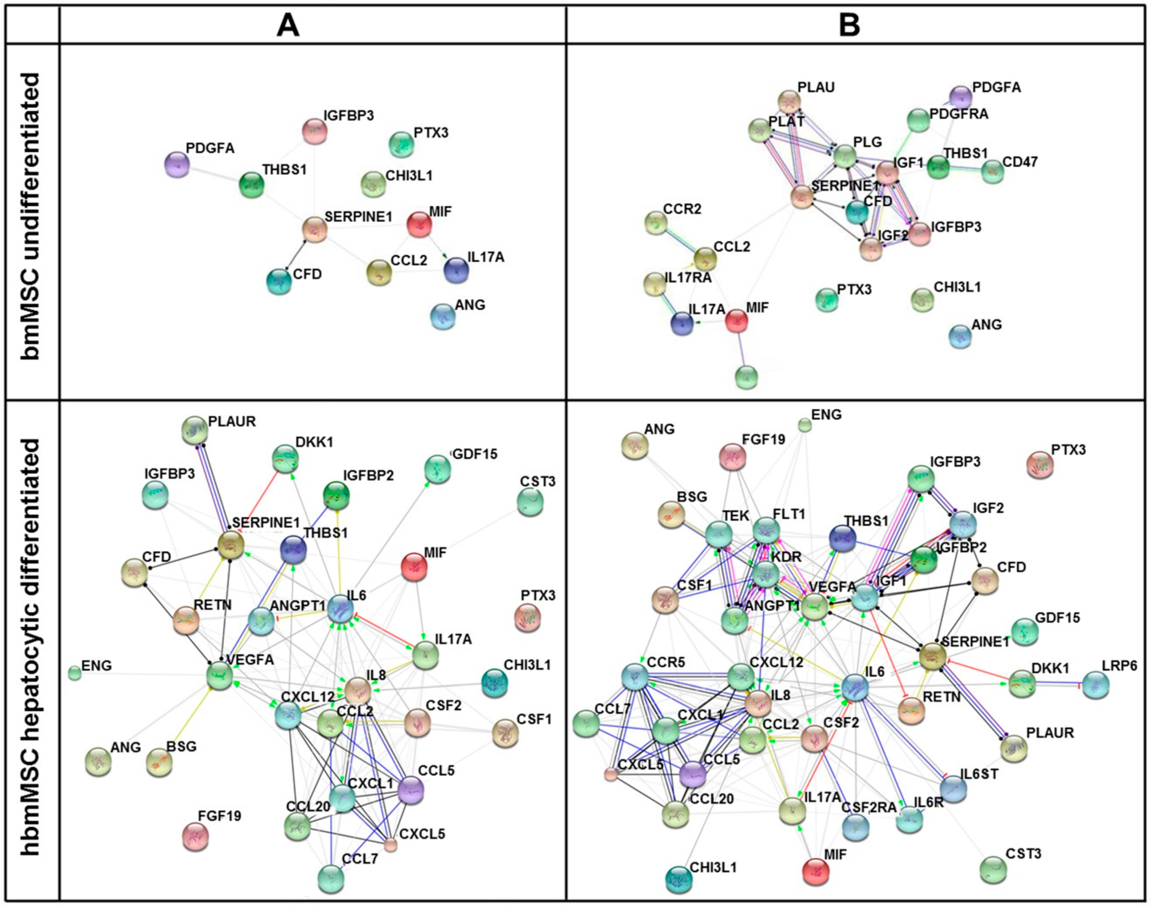Network of interacting cytokines (A) and additional 10 predicted potential interaction partners (B) of undifferentiated (upper panels) and hepatocytic differentiated (lower panels) hbmMSC. Networks were created by the STRING database using only proteins secreted to high abundance as summarized in Tables S1 and S3. Connections between partners are shown in different colours; green: activation, red: inhibition, blue: binding, cyan: phenotype, violet: catalysis, pink: posttranslational modification, black: reaction, yellow: expression. Bubble coloursare only for a better discrimination.
