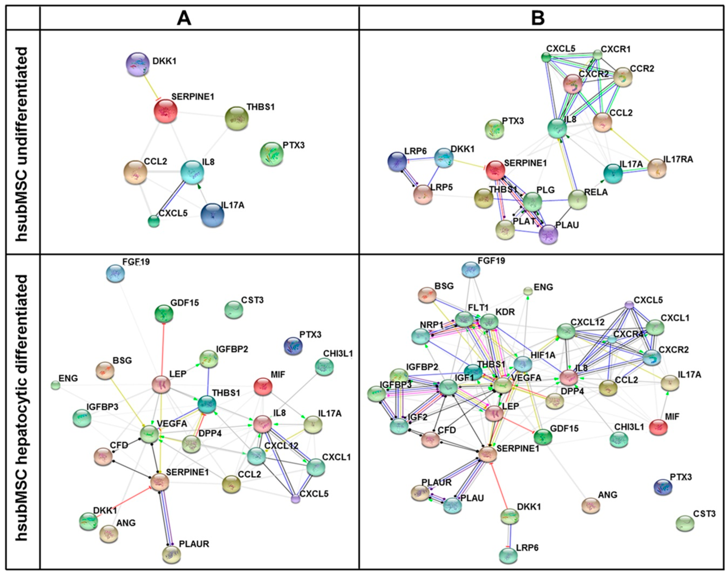 Network of interacting cytokines (A) and additional 10 predicted potential interaction partners (B) of undifferentiated (upper panels) and hepatocytic differentiated (lower panels) hsubMSC. Networks were created by the STRING database using only proteins secreted at high abundance as summarised in Tables S2 and S4. Connections between partners are shown in different colours; green: activation, red: inhibition, blue: binding, cyan: phenotype, violet: catalysis, pink: posttranslational modification, black: reaction, yellow: expression. Bubble colours are only for a better discrimination.