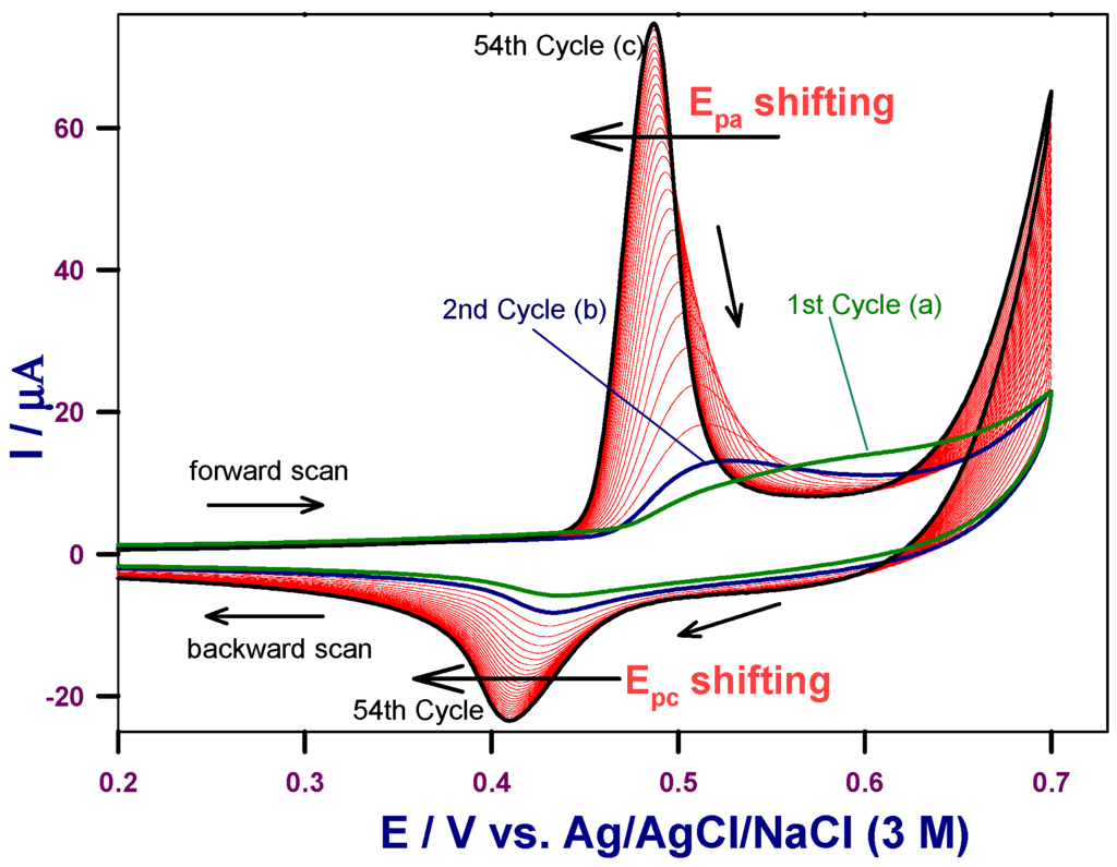 Prior to each experiment, the GCE was first polished with gamma alumina in water slurry using a polishing cloth and rinsed thoroughly with MQ water and ethanol. Then the required amount of HCNiO material was ultrasonically dispersed in methanol:water (20:1) solution to achieve a 10 mg/mL uniform ink. Finally, 2 µL of the ink was drop-casted onto the GCE and dried before the electrochemical experiments to study the properties of HCNiO/GCE. Then the electrode (HCNiO/GC) was conditioned between +0.2 to +0.7 V in 0.05 M NaOH, to attain the stable, well-defined peaks of Ni(OH)2/NiOOH film on the modified GCE by cyclic voltammetry, and the optimum 54 cycles developed as in Figure 1; its characteristic peak potentials were identified with the reported literature [10,55].