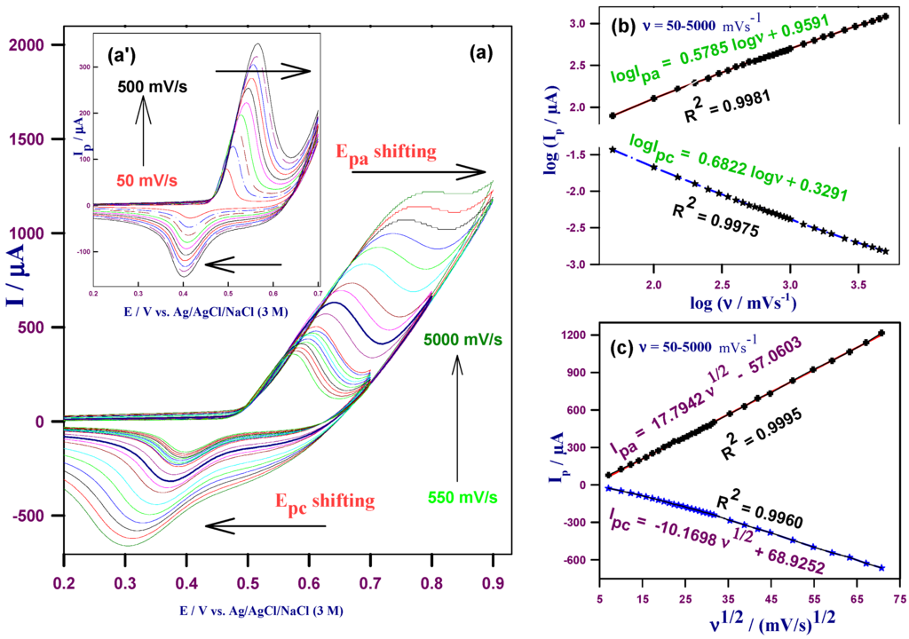 CVs of the conditioned HCNiO/GC electrode in 0.05 M NaOH at different scan rates of inset (a’) 0.05, 0.1, 0.15, 0.2, 0.25, 0.3, 0.35, 0.4, 0.45, 0.5 V·s−1 and (a) 0.55, 0.6, 0.65, 0.7, 0.75, 0.8, 0.85, 0.9, 0.95, 1, 1.25, 1.5, 1.75, 2, 2.5, 3, 3.5, 4, 4.5, and 5 V·s−1 (current response from lower to higher, respectively); (b) Plot of log Ip vs. log ν; and (c) Plot of Ip vs. ν1/2.