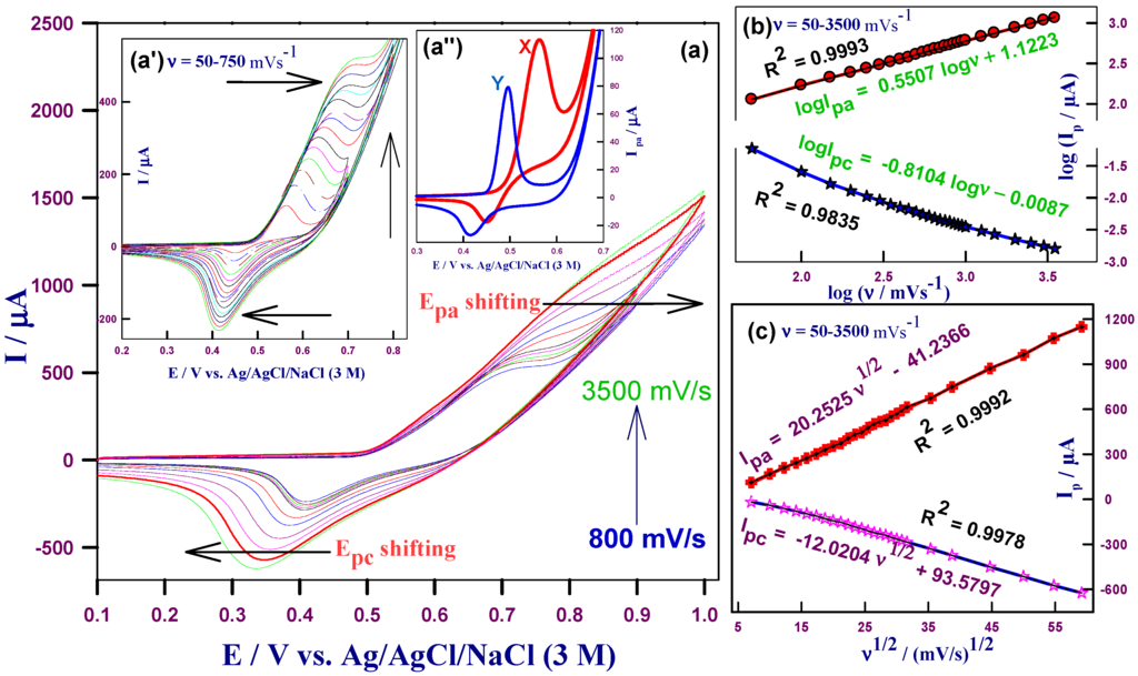 CVs of the conditioned HCNiO/GC electrode in 0.05 M NaOH containing 1 mM glucose at different scan rates of inset (a’) 0.05, 0.1, 0.15, 0.2, 0.25, 0.3, 0.35, 0.4, 0.45, 0.5, 0.55, 0.6, 0.65, 0.7, and 0.75 V·s−1 and (a) 0.8, 0.85, 0.9, 0.95, 1, 1.25, 1.5, 2, 2.5, 3, and 3.5 V s−1 (current response from lower to higher, respectively); (b) Plot of log Ip vs. log ν; and (c) plot of Ip vs. ν1/2. Inset (a”) modified electrode with 1 mM glucose (X), and without glucose (Y), in 0.05 M NaOH at the scan rate of 50 mV/s.