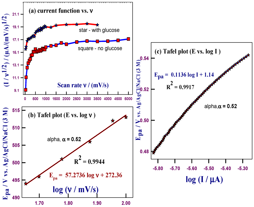 Moreover, the adsorption process confirmed by the plot of the scan rate normalized current function (I/ν1/2) vs. scan rate (ν). Current function increased with scan rate, as shown in Figure 4a. It is expected for catalytically-coupled adsorption of an electrochemical-chemical (EC’) process. Steady linearity was found at higher ν in both the presence and absence of glucose cases, which indicates that the current function is independent of ν. This consistent fact revealed that the Ni(OH)2/NiOOH transition is the quasi-reversible process in the NaOH/glucose solution [44,50]. In order to obtain information on the rate determining step (RDS), the Tafel slope “b”, was determined from the Figure 4b, plot of Ep vs. log ν, using the following Tafel equation (Equation (6)), valid for a totally irreversible diffusion-controlled process: