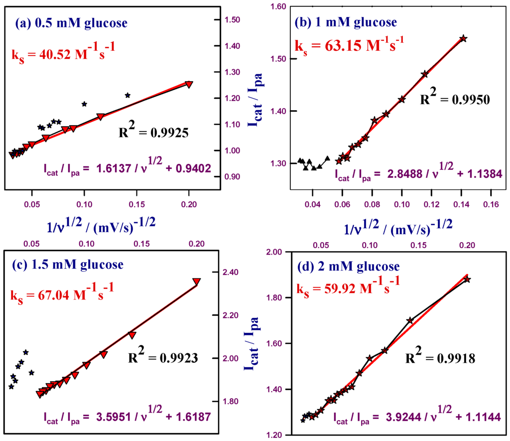 Plot of Icat/Ipa vs. 1/ν1/2 for rate constant studies on a HCNiO/GC electrode in different concentrations of glucose in 0.05 M NaOH at different ν (25–900 mV/s) (a) 0.5 mM glucose; (b) 1 mM glucose; (c) 1.5 mM glucose; and (d) 2 mM glucose.