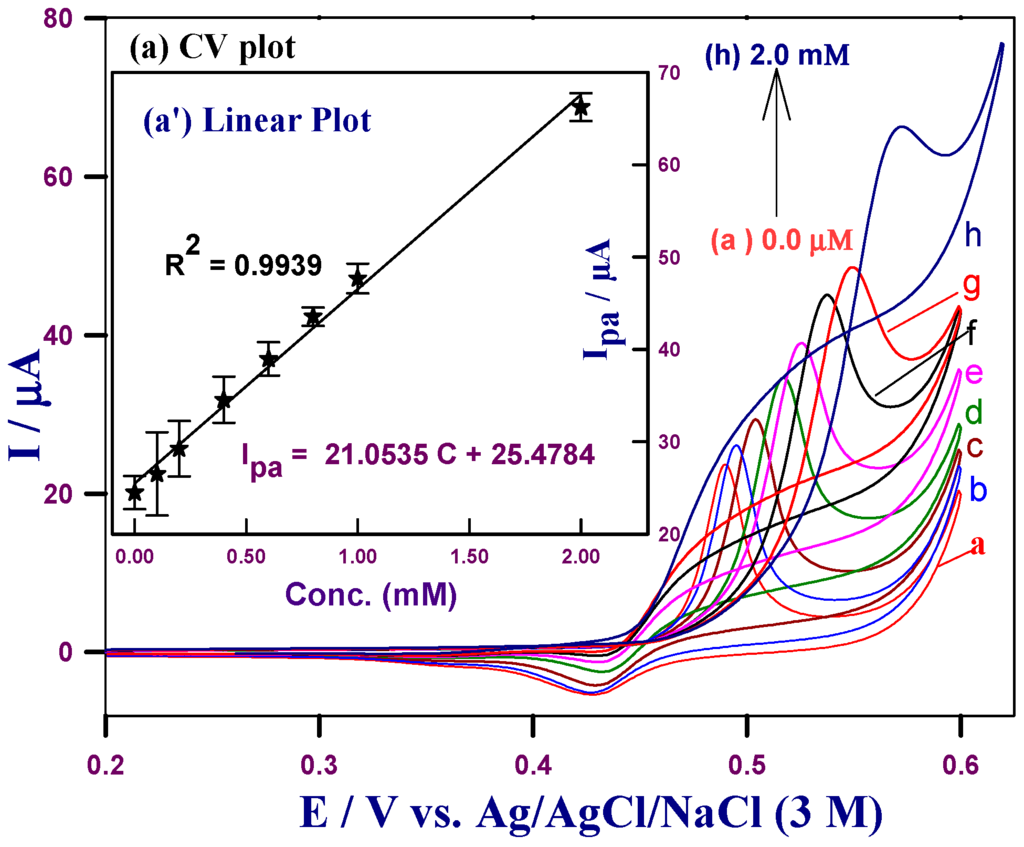 (a) CVs of the conditioned HCNiO/GC electrode in 0.05 M NaOH with different concentrations of glucose, (a) 0.0 mM; (b) 0.1 mM; (c) 0.2 mM; (d) 0.4 mM; (e) 0.6 mM; (f) 0.8 mM; (g) 1.0 mM; and (h) 2.0 mM at ν = 50 mV/s; and inset (a’) linearity plot of current vs. concentraion of the CV data. The mean peak current (n = 3) at the relevant concentration is shown with error bars equal to three standard deviation (3σ).