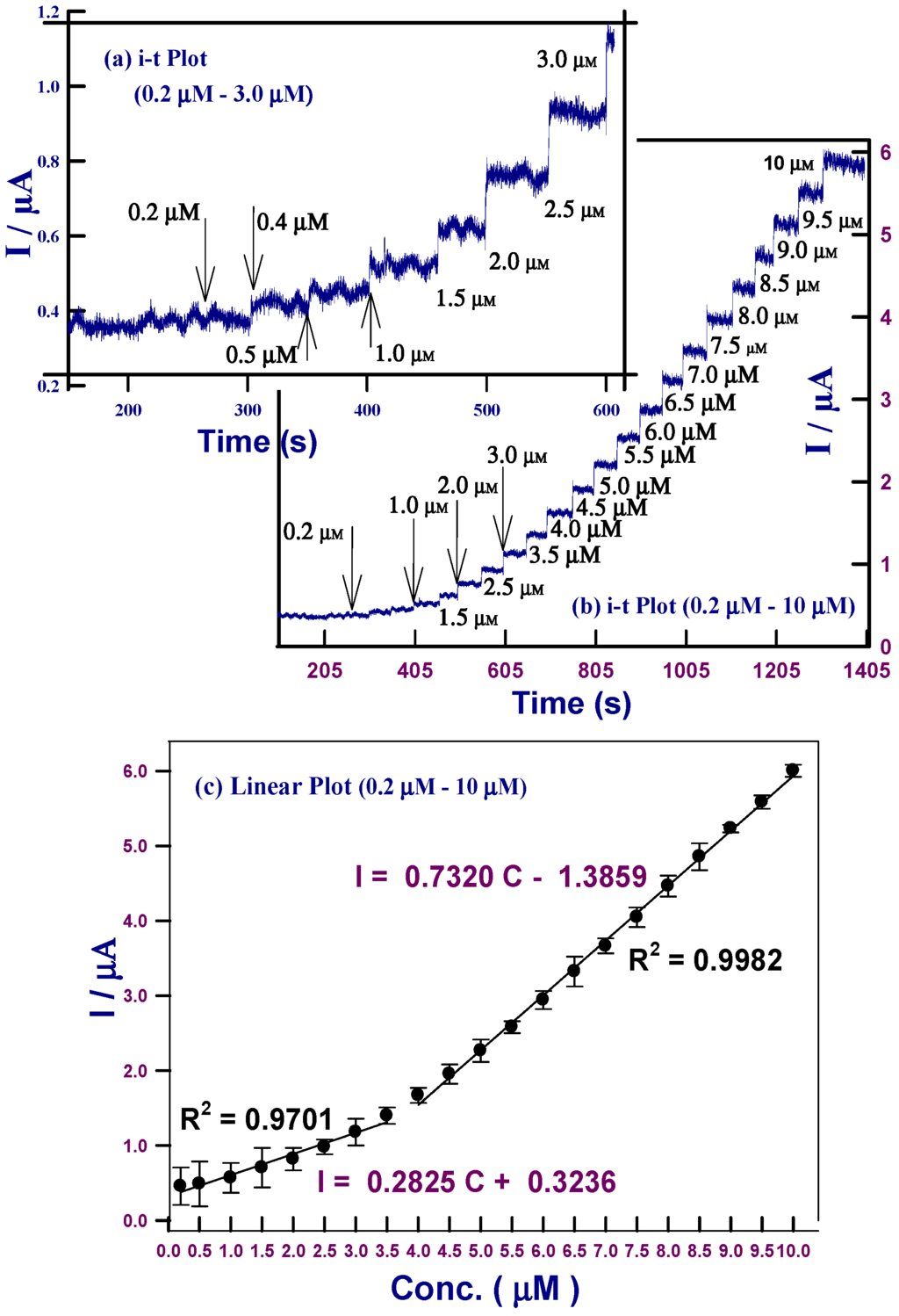 Amperometry i–t curve of a HCNiO/GC electrode in different concentrations of glucose in 0.05 M NaOH at E = 0.52 V; (a) i–t plot of 0.2 to 3 µM glucose; (b) i–t plot of 0.2 to 10 µM glucose; and (c) lnearity plot of 0.2 µM to 10 µM glucose. The mean peak current (n = 3) at the relevant concentration is shown with error bars equal to three standard deviation (3σ).