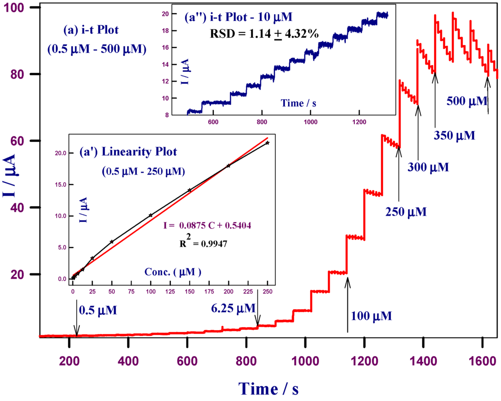 Amperometric i–t curve of a HCNiO/GC electrode in different concentrations of glucose in 0.05 M NaOH at E = 0.52 V; (a) i–t plot of 0.5 µM to 500 µM glucose; inset (a’) linearity plot of 0.5 µM to 250 µM glucose; and inset (a”) i–t plot of 10 µM glucose for Relative standard deviation (RSD).