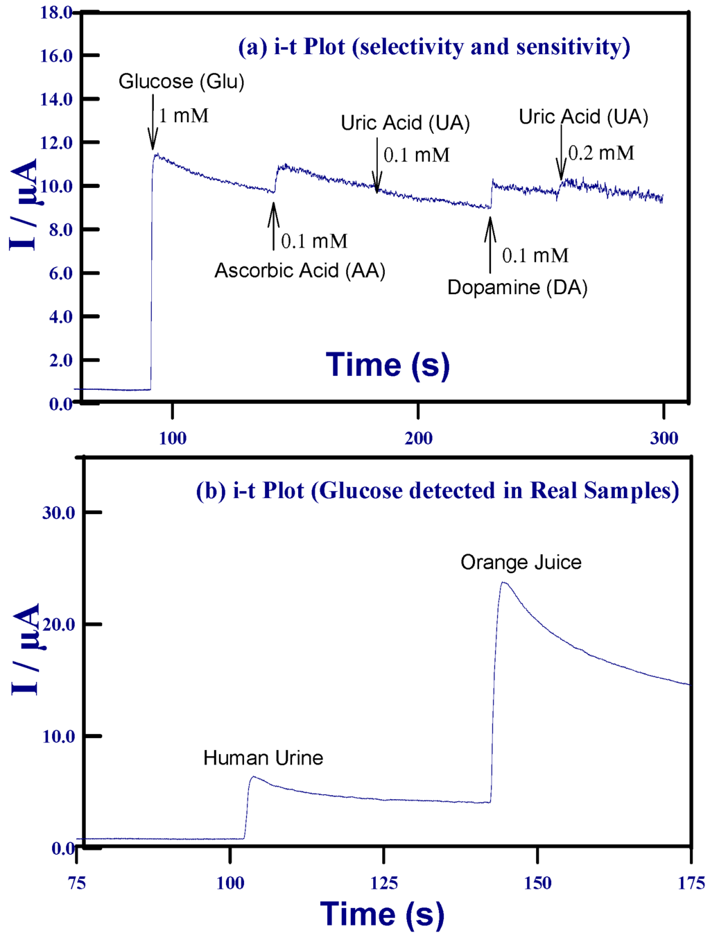 The interference test was also done to check the selectivity. The main interferents and the same oxidation potential for glucose detection in serum or other biological samples are dopamine (DA), ascorbic acid (AA), and uric acid (UA). Figure 9a expressed the selectivity by the presence of interferences of AA, UA, and DA for glucose detection. This sensor shows a better response to glucose than other interferents including AA, DA, and UA, which demonstrated good selectivity. The good result was obtained for real samples in 0.05 M NaOH, as shown in Figure 9b. This sensor could be used for the screening purposes without the invasion for the patients who suffer diabetes mellitus.