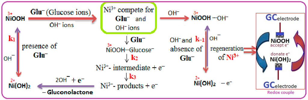 Glucose oxidation reaction mechanism under basic conditions on Ni(OH)2/NiOOH system.