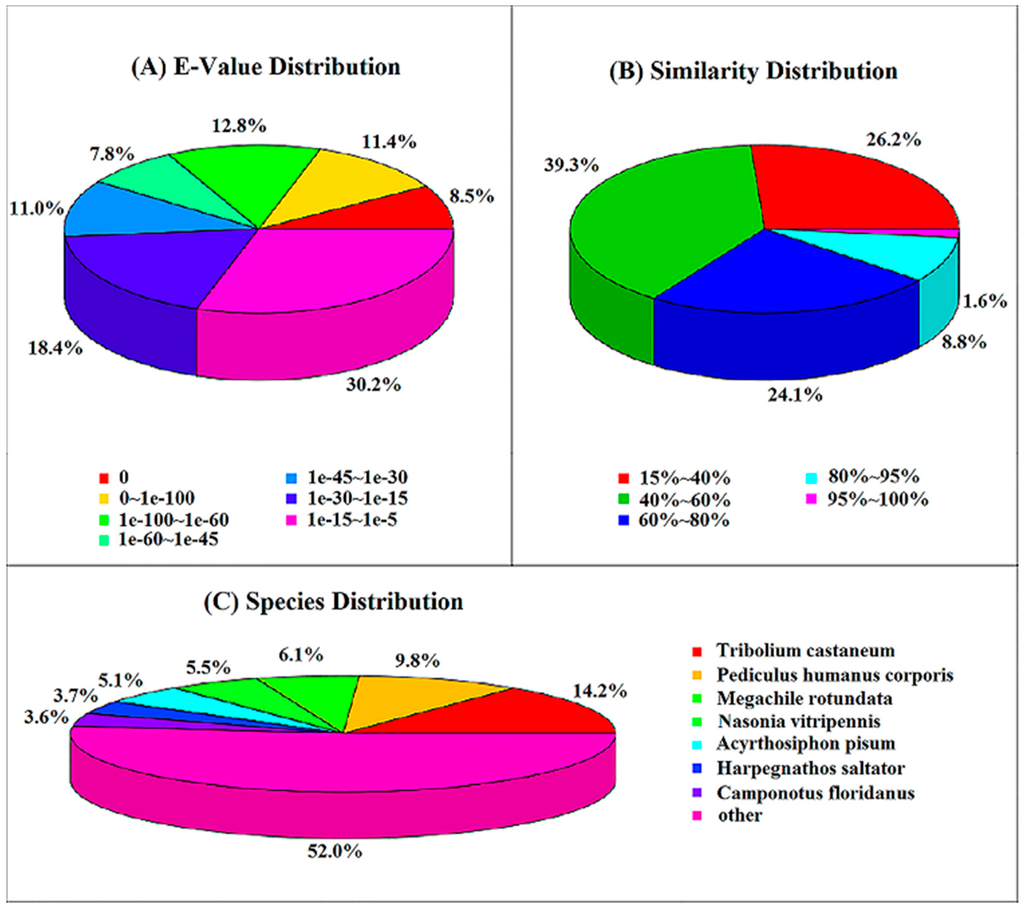 In total, 25,652 (34.36% of all distinct sequences) unigenes had Nr hits with BLASTX similarity search with the cut-off E-value of 10−5. Nr annotation and the E-value distribution indicated that 40.4% of the mapped sequences showed strong homology (E-value ≤ 10−45), whereas 59.6% of the homolog sequences ranged from 1.0 × 10−5–1.0 × 10−45 (Figure 1A). For the similarity distribution, 34.5% hits had a similarity over 60%, only 10.4% of sequences having a similarity higher than 80% (Figure 1B). For the species distribution, sequences of T. castaneum (Coleoptera, Tenebrionidae) were most commonly the top hit for sequences of S. shirakii (3649 unigenes, 14.2%). The following were Pediculus humanus corporis (9.8%), Megachile rotundata (6.1%), Nasonia vitripennis (5.5%), Acyrthosiphon pisum (5.1%), Harpegnathos saltator (3.7%) and Camponotus floridanus (3.6%) (Figure 1C).