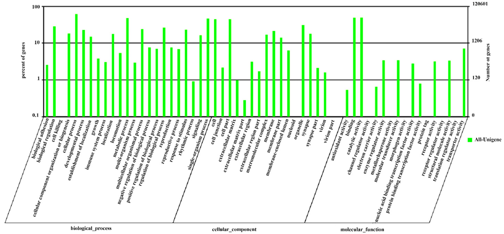 Among the 25,652 hits in the Nr database, 12,061 unigenes (47%) were assigned to one or more GO terms and 57 subcategories using Blast2GO based on BLASTX similarity searches [16]. GO includes three main functional categories: biological process, molecular function and cellular component. In addition, the terms “cellular process”, “catalytic activity”, “metabolic process”, “single-organism process” and “binding” are dominant; However, only a few genes from the “cell killing”, “virion”, “virion part” and “protein tag” terms were annotated (Figure 2).