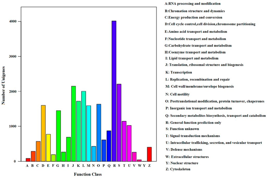 To gain a more detailed annotation of the transcriptome, we assigned COG classification terms. In total, 9558 S. shirakii unigenes had a COG classification (Figure 3). The top five groups were as follows: “a general function prediction only” (4014, 42.0%), “function unknown” (2208, 23.1%), “translation, ribosomal structure and biogenesis” (2149, 22.5%), “replication, recombination and repair” (2003, 20.9%) and “transcription” (1718, 17.9%). Among these, 23.1% of unigenes were classified as “function unknown” groups, which indicated that there could be many unique or novel genes in the S. shirakii transcriptome. “Extracellular structures”, “nuclear structure” and “RNA processing and modification” consisted of 44, 4 and 88 unigenes, respectively, representing the smallest COG groups (Figure 3).