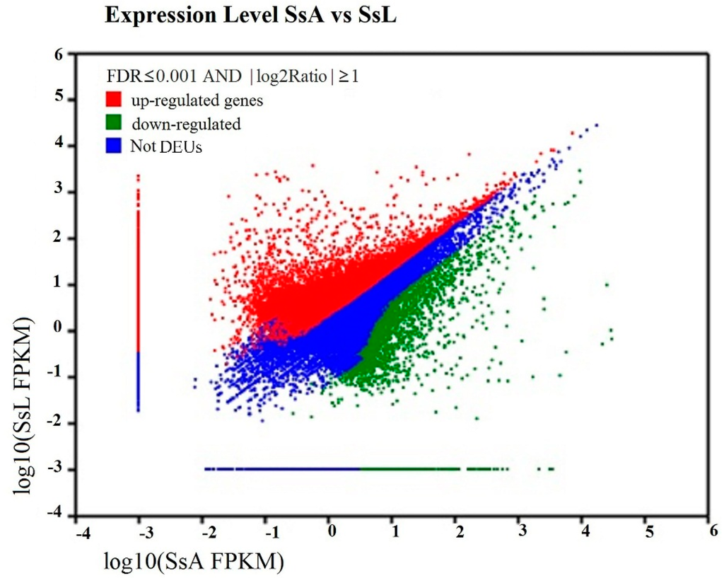 Comparison of unigene expression between adults and larvae of Shirakiacris shirakii. The differentially-expressed unigenes (DEUs) are shown in red and green, while blue indicates unigenes that were not differentially-expressed between the adults and larvae of S. shirakii. SsA represents the adults of S. shirakii; SsL represents the larvae of S. shirakii.