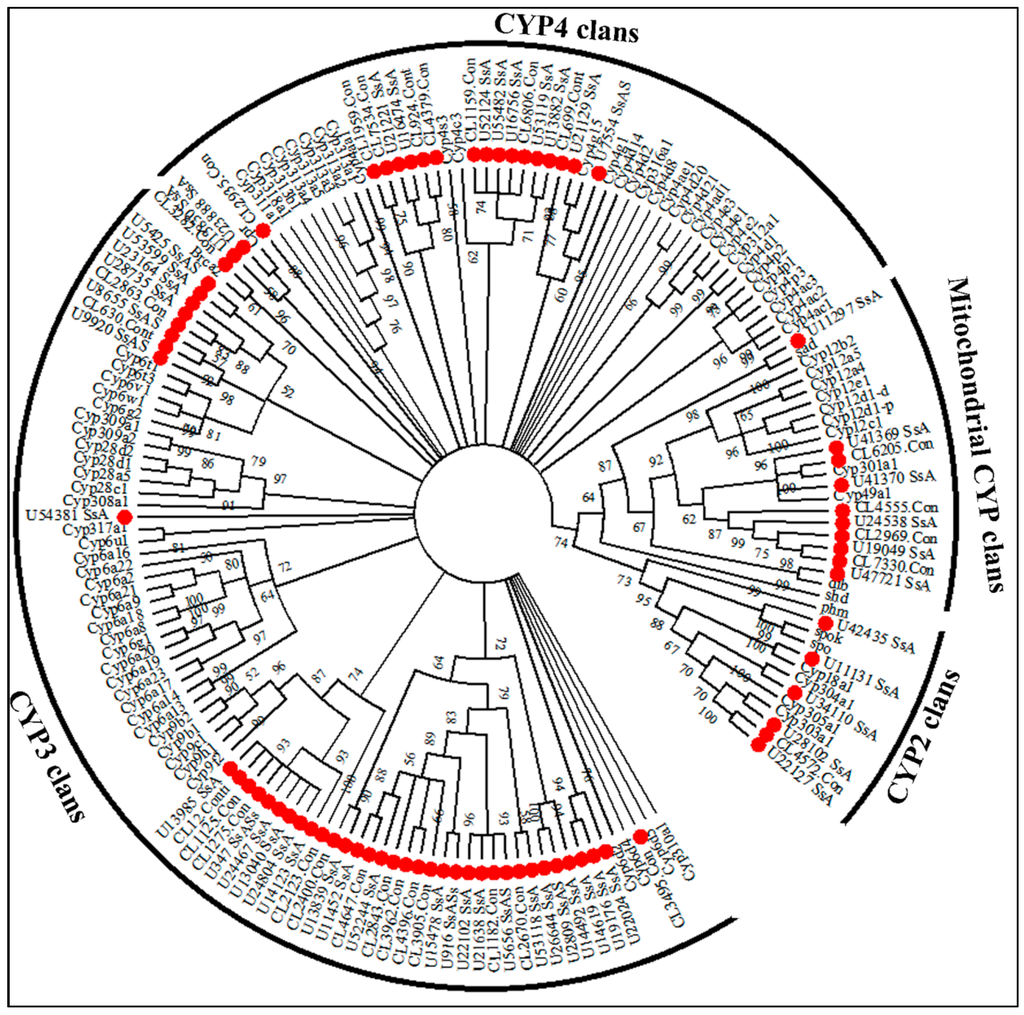 The phylogenetic analysis of sequences encoding P450s from S. shirakii and D. melanogaster. Branch numbers represent bootstrap values (1000 replicates). The 79 S. shirakii unigenes encoding P450s are marked with filled red circles. The sequences used to reconstruct the maximum likelihood (ML) tree are available as S1 Data.
