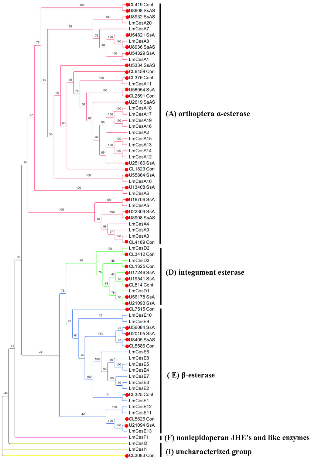 The phylogenetic analysis of sequences encoding CarEs from S. shirakii and L. migratoria. Branch numbers represent bootstrap values (1000 replicates). The 36 S. shirakii unigenes encoding CarEs are marked with filled red circles. The sequences used to reconstruct the maximum likelihood (ML) tree are available as S2 Data.