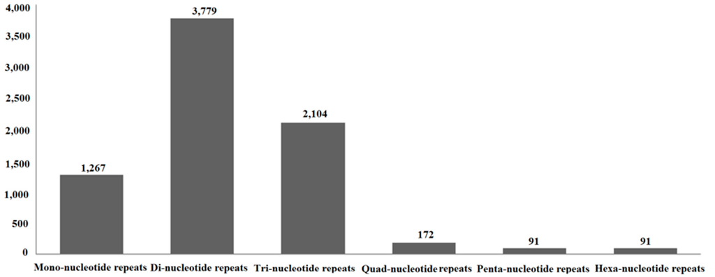 The standard experimental methods for simple sequence repeat (SSR) markers’ identification are time consuming and expensive. Transcriptome sequencing provides a good method to obtain SSRs. SSRs from numerous species have been obtained by transcriptome sequencing, given its high throughput [14,15]. In the present study, we identified the SSRs of S. shirakii.