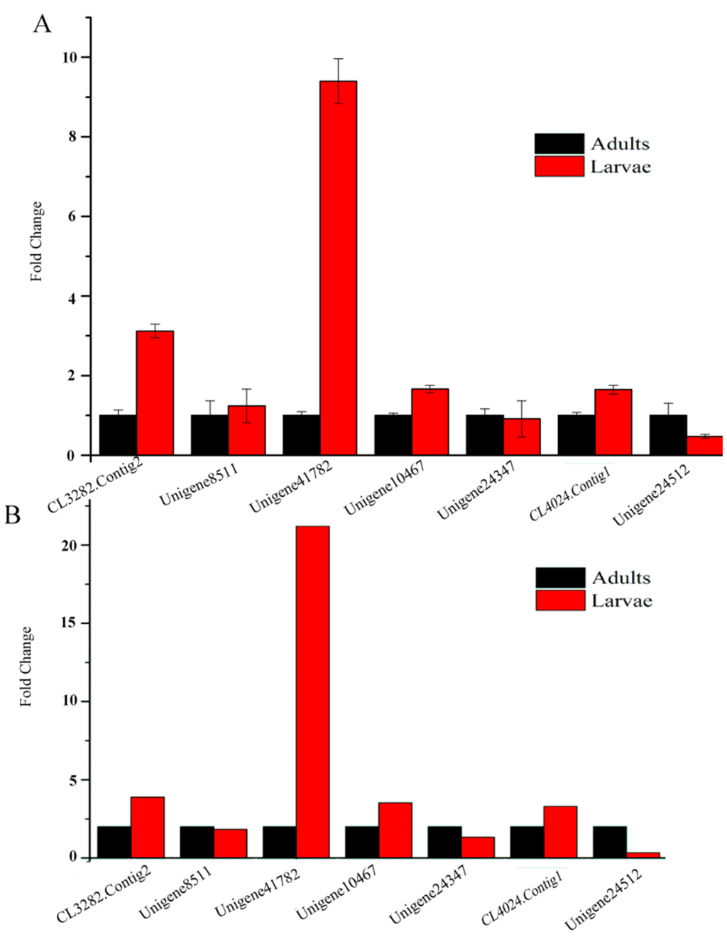 To validate our transcriptome data, we randomly chose seven unigenes, designed primers and used the gapdh gene as the control to measure their expression in the same RNA sample of adults and larvae by qRT-PCR. All seven unigenes’ results showed uniformly consistent results in RT-PCR with RNA-Seq (Figure 8), which indicates that transcriptome sequencing was reliable and that we could make reasonable deductions from the functional enrichment analysis of the DEUs.