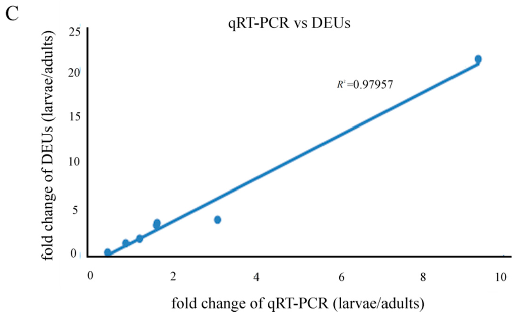 To validate transcriptome sequencing reliability, the same RNA samples for sequencing from adult and larval samples were used for qRT-PCR. We randomly selected seven unigenes to confirm their expressions. RNA levels were measured with the SYBR Premix ExTag quantitative PCR kit (Takara, Dalian, China), and the PCR conditions were as follows: 95 °C for 30 s, 40 cycles at 94 °C for 10 s, 60 °C for 34 s. DEUs’ expression was analyzed using CFX96 (Bio-Rad, Hercules, CA, USA). gapdh was used as the reference gene. The expression of the target genes relative to gapdh was assessed using the 2−ΔΔCt method. The experiments were repeated three times for each group, and the mean values were calculated. All of the primer sequences used for qRT-PCR are listed in Table S10.