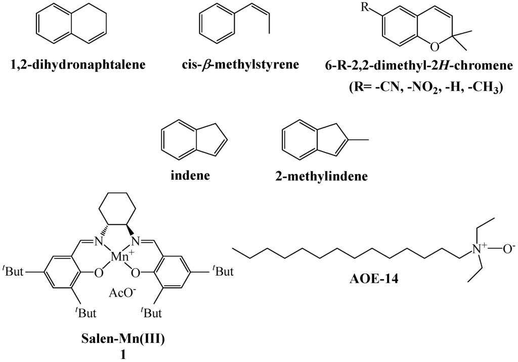 Therefore, the epoxidation reactions of some reactive standard alkenes (Figure 1), using H2O2 as oxidant and catalyzed by Jacobsen (salen)Mn(III), were carried on at 25 °C in water in the presence of AOE-14, as both surfactant and cocatalyst. Preliminary experiments were performed to set up optimal reaction conditions (Table 1).