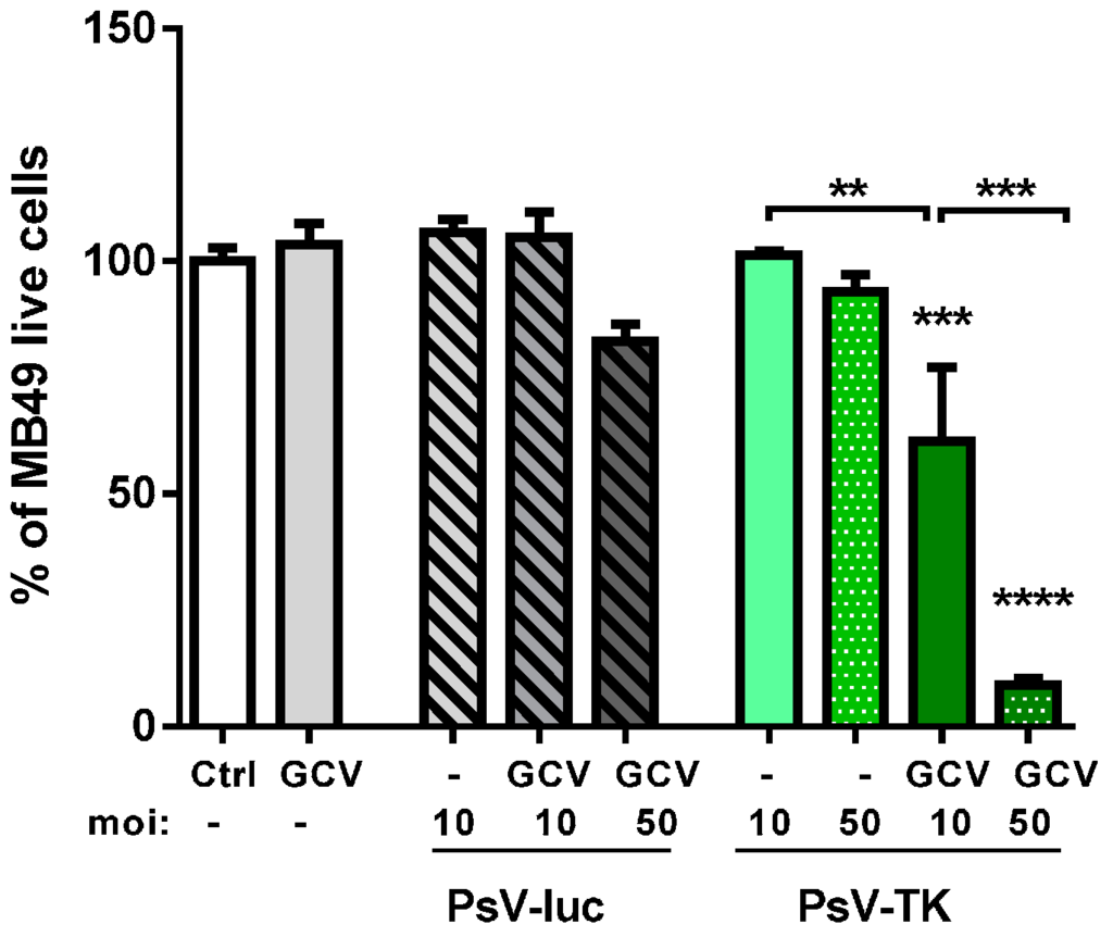 In vitro toxicity of pseudovirions encoding for thymidine kinase (PsV-TK)/Ganciclovir (GCV): Mean ± standard error of the mean (SEM) percentage (%) of viable MB49-cells 6 days after infection with PsV encoding for luciferase (PSV-luc) (stripped bars) or PsV-TK (green bars) at multiplicity of infection (moi) 10 or 50 and in presence or absence of GCV treatment (as indicated) or with GCV treatment alone (plain grey bar) as normalized to untreated cells (Ctrl, white bar). Significant differences with the control group following one-way ANOVA and Tukey post-test are indicated above the bars. Significant differences between specific groups are also shown: ** for p < 0.01, *** for p < 0.001 and **** for p < 0.0001.