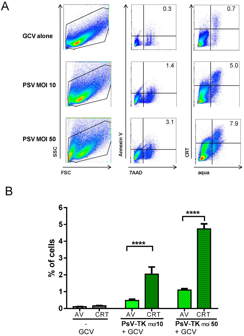 PsV-TK/GCV induced immunogenic cell-death in vitro: Flow cytometry analysis of MB49-cells recovered 3–4 days after infection with PsV-TK at moi 10 or 50 followed by GCV or treated with GCV alone and stained for AnnexinV (AV), Calreticuline (CRT) and dead/live markers (7AAD and aqua). A representative plot showing Forward-scattered light (FSC)/side-scattered light (SSC) (left plots), apoptosis (AV, 7AAD, middle plots) and CRT exposure (right plots) for each treatment is shown for each group in (A) Mean ± SEM percentage (%) of cells in early apoptosis (AV: AV+7AAD−) or with early CRT exposure (CRT: CRT+aqua−) are shown for each treatment groups (B). Significant differences between AV and CRT among each treatment group are shown following one-way ANOVA and Tukey post-test: **** for p < 0.0001.