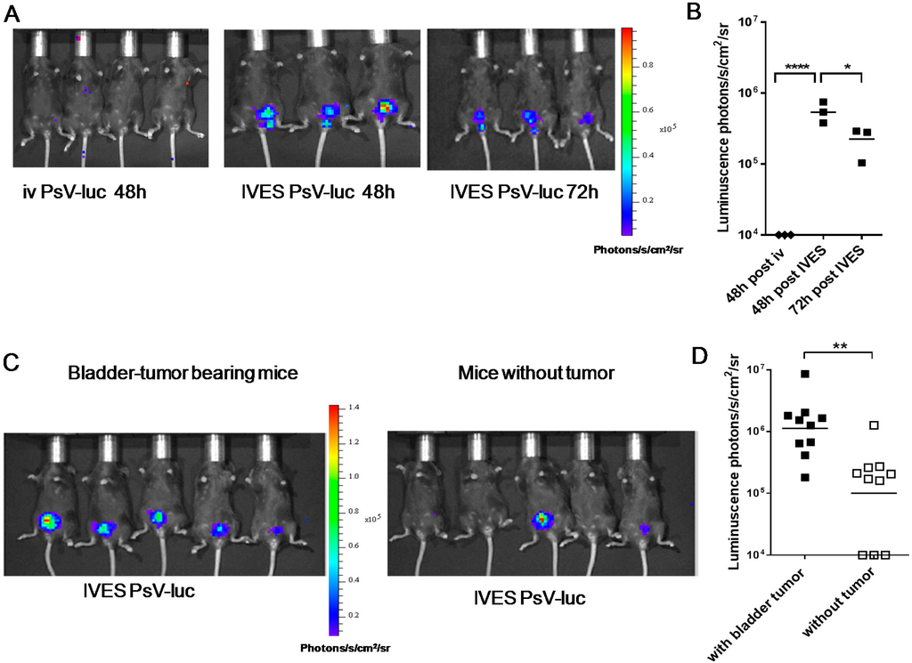 Bladder-tumor infection with PsV-luc: Efficacy of PsV-luc pseudoinfection was assessed by bioluminescence imaging 48 and/or 72 h after intravenous (iv) or intravesical (IVES) administration in mice bearing MB49 bladder-tumors (A,B) or 48 h after IVES administration in mice with or without bladder tumors (C,D). Representative Xenogen photographic images are shown in (A,C), while luminescence quantification of bladder/bladder tumors are shown in (B,D). Significant differences following a Student t-test are indicated by * for p < 0.05, ** for p < 0.01, and **** for p < 0.0001.