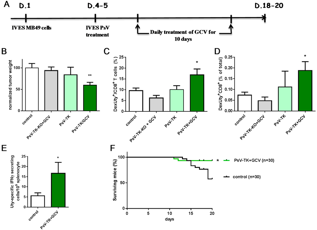 IVES PsV-TK/GCV increase tumor-specific CD8 T cells, tumor regression and mice survival: Tumor-bearing mice received different IVES PsV with or without ip GCV according to the time-line in days (D.) drawn in (A); Mean ± SEM normalized bladder-tumor weights (in relative units, RU) of mice that were alive at day 18–20, including untreated control mice (n = 18), mice that received the non-functional PsV-TK-KO + GCV (n = 4, grey bar), PsV-TK without GCV (n = 5, light green bar) and PsV-TK + GCV (n = 24) are shown in (B); Flow cytometry analysis of bladder tumors, for the presence of MB49-specific CD8 T-cells (DexUty+CD8+) is shown as percentage (mean ± SEM) among CD8 T-cells in (C) and among total cells in (D); Spleen of control mice (n = 21) and PsV-TK + GCV treated mice (n = 17) were analyzed by ELISPOT for the presence of effector MB49-specific CD8 T-cells (Uty-specific IFN-γ secreting cells), mean ± SEM/105 cells are shown in (E); Surviving mice over time are shown for the PsV-TK + GCV treatment (green line) and control mice (black line) in (F). Significant differences following one-way ANOVA and Tukey post-test for B, C and D, a student t-test for E and a log-rank test for F are indicated by * for p < 0.05, ** for p < 0.01.