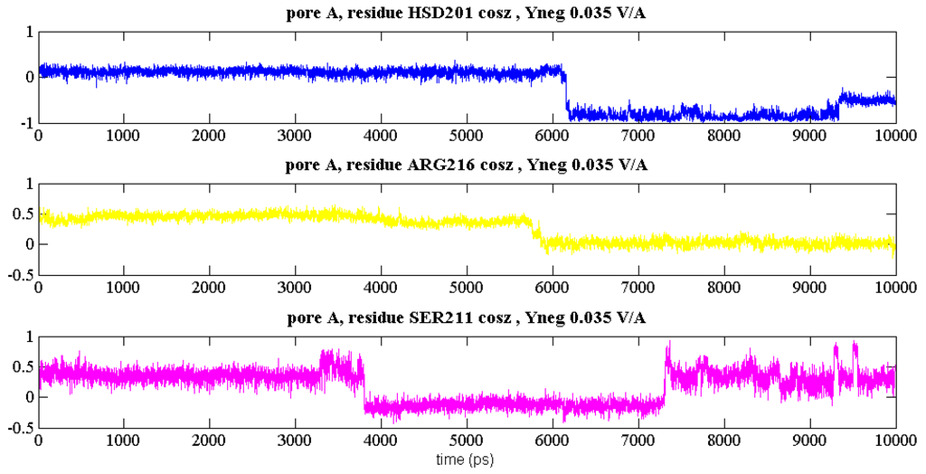 - Garate, J.-A.; English, N.J.; MacElroy, J.M.D. Human aquaporin 4 gating dynamics in dc and ac electric fields: A molecular dynamics study. J. Chem. Phys. 2011, 136, 055110. [Google Scholar] [CrossRef] [PubMed]