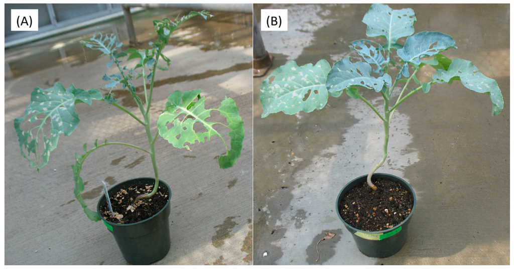 JAs are important compounds in plant defense. In response to JA or MeJA treatment, concentrations of several different direct or indirect defense compounds, including proteinase inhibitors, polyphenol oxidases, nicotine, and glucosinolates, have been shown to increase [9,10,11,12]. Several studies have reported that herbivore behavior or development is affected by jasmonate elicitation [13]. For example, JA treatments have been shown to decrease the abundance of caterpillars, flea beetles, aphids, and thrips in tomatoes under field conditions [14]. JA treatments on Brussels sprouts changed oviposition preference of Pieris rapae and Pieris brassicae and the time from egg hatch to pupation [15]. In particular, there have been a number of studies investigating the effect of glucosinolates on insect herbivory [16].