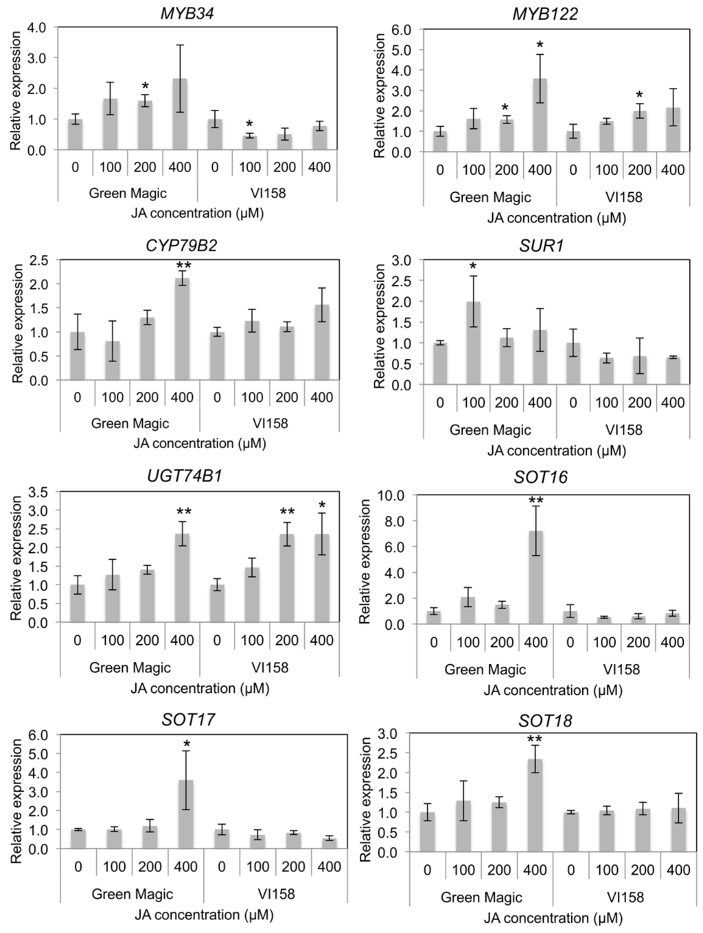 Indole GS biosynthesis and hydrolysis gene expression was measured by quantitative Real Time- Polymerase Chain Reaction (qRT-PCR) in order to determine possible reasons for differences in glucosinolate inducibility from JA treatments. A previous study reported that transcriptional factors including MYB34 and MYB122 regulate JA-mediated indole GS biosynthesis in Arabidopsis [38]. Gene expression of both MYB34 and MYB122 increased with increasing JA concentrations in Green Magic seedlings while only MYB122 showed this response in VI-158 (Figure 3 and Figure S2). The gene expression of MYB34 in VI-158 decreased compared to the control for all JA treatments. The gene expression of the indole core biosynthesis genes, including CYP79B2, UGT74B1, and SOT16, were generally only increased in Green Magic and only significantly at the 400 µM JA treatment level. In addition, aliphatic GS-associated sulfotransferases, SOT17 and SOT18, showed significant increases in transcription with 400 µM JA treatments. This result may explain to the increase in glucoiberin observed with increasing JA concentrations. It should be noted, however, that although the 400 µM JA treatment significantly increased transcription of all measured sulfotransferases, the increase was greatest for SOT16 (>6-fold; Figure 3 and Figure S2), the sulfotransferase related to indole GS biosynthesis. For VI-158, transcription of UGT74B1 was significantly increased with both 200 and 400 µM JA treatments, while this was true for only the 400 µM treatment in Green Magic. Somewhat contrary to the observed pattern, SUR1 transcription was significantly increased by JA treatments only in Green Magic, but with the only notable increase (≈2-fold) at the 100 µM JA treatment level.
