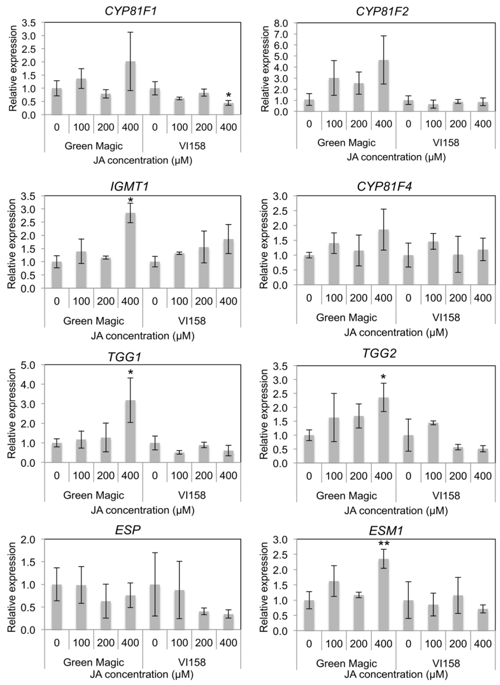 In indole GS side chain modification-related gene expression, CYP81F1, CYP81F2, and CYP81F4 were not significantly changed after JA treatment in either cultivar (Figure 4 and Figure S2). However, some trends were observable in the transcription of these genes that differed between the two cultivars. In general, Green Magic showed an increase in transcription of CYP81F family genes with increasing JA concentration, while no increase, or even a slight decrease, was observed in VI-158 (Figure 4 and Figure S2). The gene expression of IGMT1, which is responsible for O-methyltransferase activity needed to create neoglucobrassicin and 4-methoxy glucobrassicin, was significantly increased only in the 400 µM JA treated Green Magic broccoli plants (Figure 4 and Figure S2). The gene expression of myrosinase enzymes TGG1 and TGG2 was also only increased in 400 µM JA-treated Green Magic broccoli tissue. The gene expression of ESM1 was significantly increased in 400 µM JA-treated Green Magic broccoli seedlings although the gene expression of ESP was not significantly changed by JA treatment. These increases in TGG1, TGG2, and ESM1 transcription can help to explain the stark increase in MI3C concentrations in Green Magic. It is known that ESM1 antagonizes ESP activity and influences GS hydrolysis towards isothiocyanates for a number of GSs. In the case of neoglucobrassicin hydrolysis, the isothiocyanate formed is highly unstable and is known to rearrange into MI3C and NeoASG, among other products [39]. Additionally, increasing the abundance of myrosinase may lead to the formation of more isothiocyanates, as this is the major hydrolysis product produced in the absence of specifier proteins and with limiting Fe2+ [40,41].