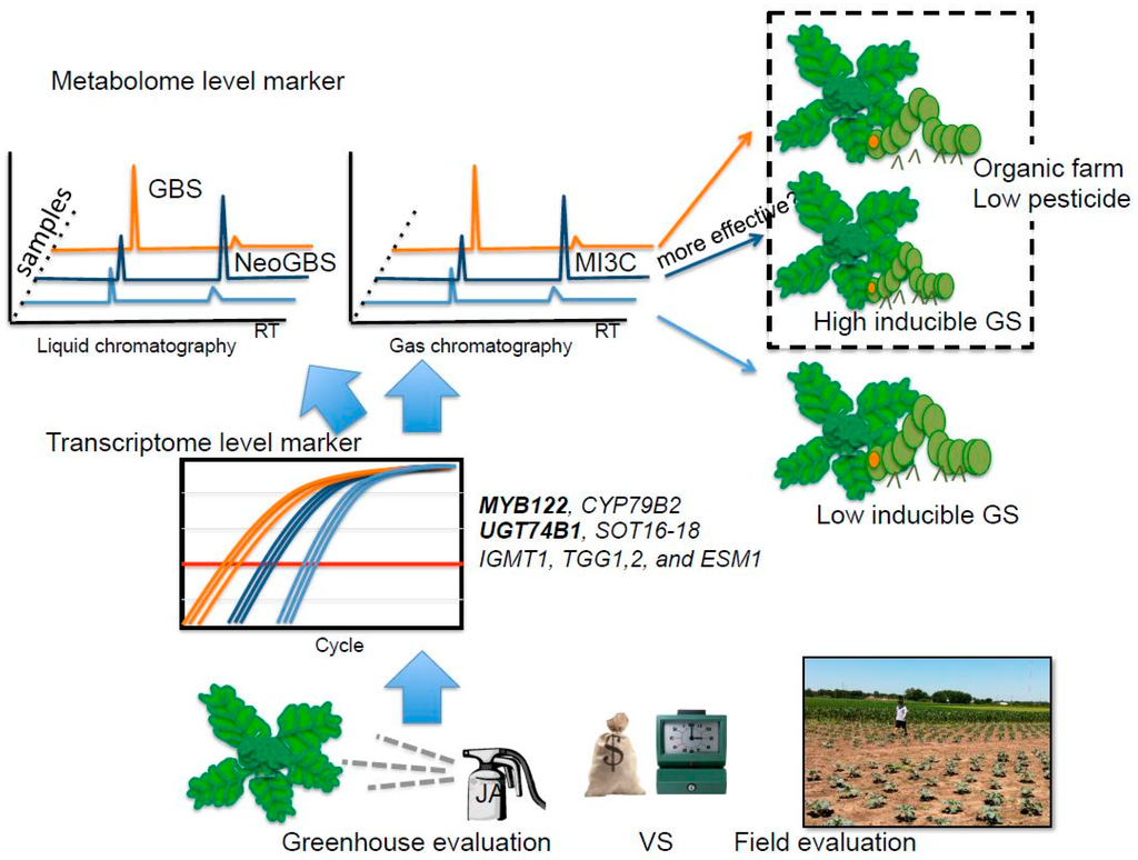 Possible breeding scheme for insect resistant germplasm by using JA/MeJA application to evaluate inducible GS and other defense mechanisms at the metabolite and transcriptome level. GBS: glucobrassicin, NeoGBS: neoglucobrassicin; MI3C: N-methoxyindole-3-carbinol. Transcript levels of MYB122 and UGT74B1 were commonly increased in two broccoli cultivars.