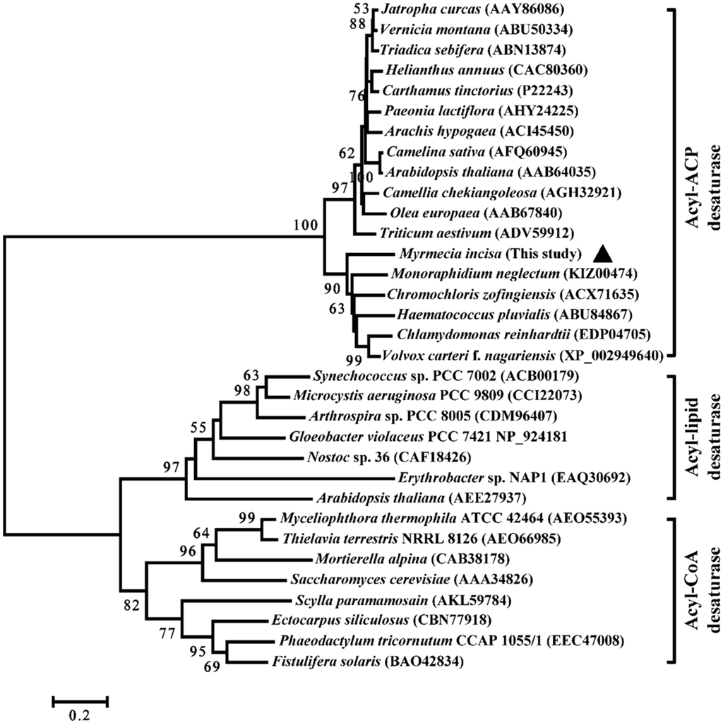 Chicago/Turabian StyleXue, Wen-Bin, Fan Liu, Zheng Sun, and Zhi-Gang Zhou. 2016. "A Δ-9 Fatty Acid Desaturase Gene in the Microalga Myrmecia incisa Reisigl: Cloning and Functional Analysis" International Journal of Molecular Sciences 17, no. 7: 1143. https://doi.org/10.3390/ijms17071143