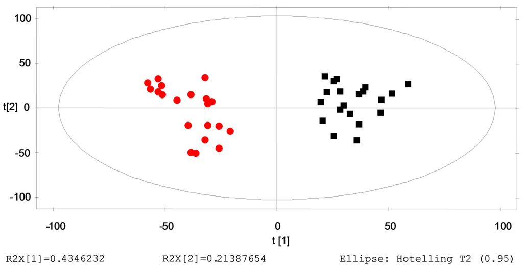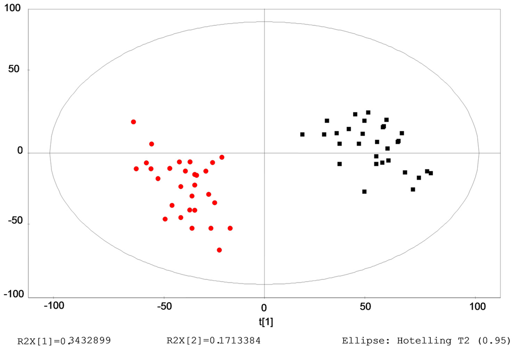 Multiple pattern recognition of metabolites in initial stage (healthy) and outcome stage (ILAs) groups. PLS-DA score plot (n = 40): Initial stage (healthy) group (■); and outcome stage (ILAs) group (●).