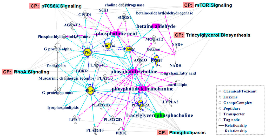 Through the comparison between these metabolites and the predicted metabolites, we found that up-regulated phosphatidylcholine (PC), phosphatidic acid (PA), phosphatidylethanolamine (PE) and betaine aldehyde (BA), as well as down-regulated 1-acylglycerophosphocholine (1-acyl-GPC), were their common metabolites. The correlations between the metabolites were identified using IPA. As shown in Figure 3, these metabolites are correlated with some canonical pathways, such as phospholipases, triacylglycerol biosynthesis, RhoA signaling, P70S6K signaling, mTOR signaling, etc. (Table S1). The associated biological functions were focused on lipid metabolism, carbohydrate metabolism and energy production.