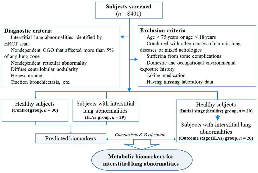 ILAs were identified by HRCT. Some subjects were excluded for the following reasons: age ≥75 years old or age ≤18 years old; other causes of chronic lung diseases or mixed etiologies (asthma, emphysema, cor pulmonale, chronic obstructive pulmonary disease, lung fibrosis, pneumoconiosis and lung cancer); complications such as cardiovascular and cerebrovascular diseases, chronic liver disease, gastrointestinal disease, nephropathy, and metabolic syndrome; domestic and occupational environmental exposure histories; and intake of certain drugs (bleomycin, cyclosporine, sirolimus, mycophenolic acid, amiodarone, Dilantin, statins and azathioprine).