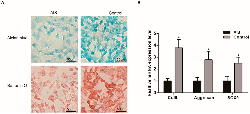 Human facet joints were obtained from the AIS and the control group during surgery, and primary chondrocytes were isolated from the cartilage tissue. The chondrocytes were identified at passage 3. All cultures were shown chondrocytes proved by positive toluidine blue staining and ColII immunofluorescence (Figure S1). Upon examination by inverted phase contrast microscopy, the primary cells from the AIS group showed no obvious morphological differences from the control group. Alcian blue and Safranin O staining showed less accumulation of glycosaminoglycans (GAGs) and proteoglycans in the AIS group (Figure 1A). To examine the expression of chondrogenic marker genes in the chondrocytes from the two groups, we performed RT-PCR for ColII, Aggrecan, and Sox9. The results showed that ColII, Aggrecan, and Sox9 expression was significantly reduced in the AIS group (Figure 1B).