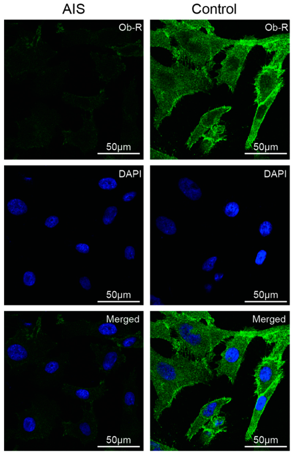 To assess the total serum leptin levels, 31 girls with AIS aged between 10 and 16 years and 15 non-AIS age-matched girls were recruited, and their total serum leptin levels were determined using an ELISA kit. The results and other anthropometric data of the AIS and healthy patients are listed in Table 1. The girls with AIS had significantly reduced body weights (40.90 ± 4.56 vs. 44.87 ± 4.47 kg, p = 0.008) and BMIs (17.66 ± 1.15 vs. 19.66 ± 0.91 kg/m2, p < 0.001). The ages, body heights, and total serum leptin levels (7.62 ± 2.80 vs. 8.89 ± 4.15 ng/mL, p = 0.294) were similar between the two groups. The Ob-R levels in the primary chondrocytes were determined by immunofluorescence. The AIS group showed a lower Ob-R signal than the controls (Figure 2).