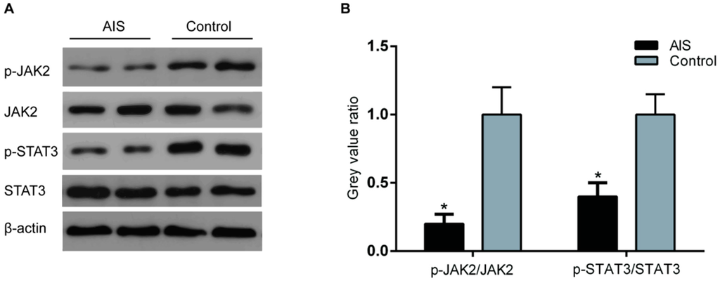 To determine the activation level of the major leptin signaling pathway—the JAK2/STAT3 signaling pathway—in AIS patients, we obtained the facet joints during surgery, and extracted the protein samples from the cartilage tissue of the facet joint. JAK2 and STAT3 expression and phosphorylation (two main participants in the JAK2/STAT3 signaling pathway) were detected by Western blotting. The results showed a reduction in the p-JAK2 and p-STAT3 levels in the AIS patients, but JAK2 and STAT3 expression was not significantly different between the two groups (Figure 3).
