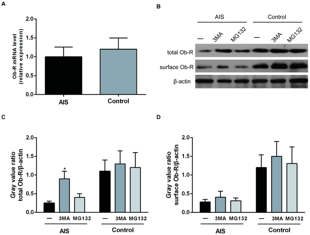 In the present study, we hypothesized that the low membrane expression of Ob-R may be associated with the pathogenesis of AIS. The role of Ob-R level in determining chondrocyte function was examined, and the underlying mechanism of abnormal Ob-R metabolism was also studied.