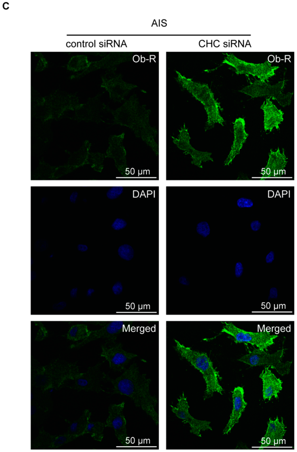 Because the inhibition of Ob-R lysosomal degradation had no effect on Ob-R cell surface expression, we hypothesized that inadequate endocytosis of Ob-R may accelerate the rate of Ob-R internalization in AIS primary chondrocytes. To investigate whether endocytosis affects the membrane expression of Ob-R, the expression of CHC was inhibited by siRNA transfection in primary chondrocytes from the AIS group (Figure 6A). The cell surface protein were biotinylated to elucidate the contribution of CHC to Ob-R expression. CHC knockdown led to a significant increase in the membrane expression of Ob-R, but it did not increase total Ob-R expression (Figure 6B). The effects of CHC knockdown were confirmed by immunofluorescence staining of AIS primary chondrocytes after CHC siRNA transfection; strong signals of Ob-R were observed in the membrane (Figure 6C).