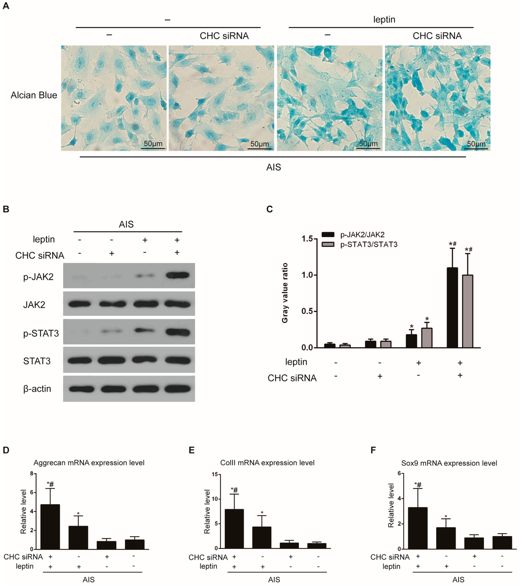 Finally, we examined whether CHC knockdown affects the AIS primary chondrocytes’ reactivity to leptin. After combining CHC siRNA transfection with leptin treatment, the expression of GAGs, p-JAK2 and p-STAT3 proteins, and Aggrecan, ColII, and Sox9 mRNAs were examined. As expected, chondrocytes that were transfected with the CHC siRNA and then incubated with 10 ng/mL leptin for 5 h exhibited increased GAG accumulation, JAK2 and STAT3 phosphorylation, and Aggrecan (4.73-fold), ColII (7.92-fold), and Sox9 (3.30-fold) mRNA expression levels compared with the control cells untreated with CHC siRNA or leptin. (Figure 7).