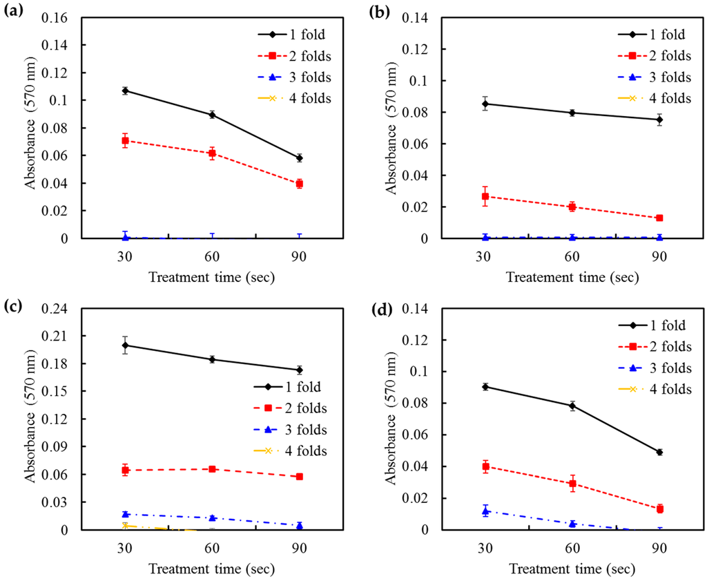 The antimicrobial effect of hypochlorous acid (HOCl) at different volume ratios and treatment times on (a) E. coli; (b) P. gingivalis; (c) E. faecalis; and (d) S. sanguinis. The results were reported in absorbance units. HOCl showed volume-dependent antibacterial ability against all four species. The antibacterial efficacy of HOCl was also time-dependent.