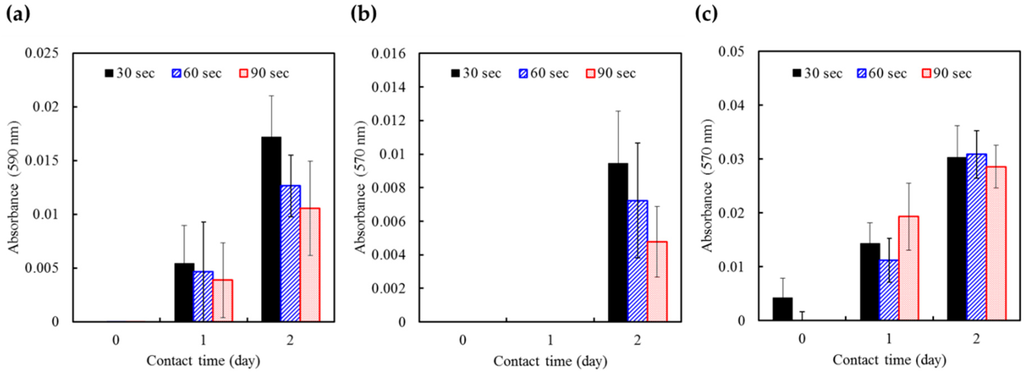 The changes in the antimicrobial effectiveness of HOCl as a function of contact time with air on (a) E. coli; (b) P. gingivalis; and (c) E. faecalis. The volume ratio of HOCl to bacterial suspension was 4:1. The results were reported in absorbance units. The duration of air contact adversely affected the antimicrobial activity of HOCl; however, the treatment duration did not have a significant effect.