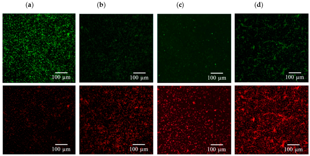 Viability staining of (a) E. faecalis exposed to (b) HOCl, (c) NaOCl, and (d) CHX. Viable bacteria are labeled green, and dead bacteria are labeled red. The dead bacteria in the irrigant-treated groups made up a greater proportion of the total bacteria on the titanium alloy surfaces when compared with the control.