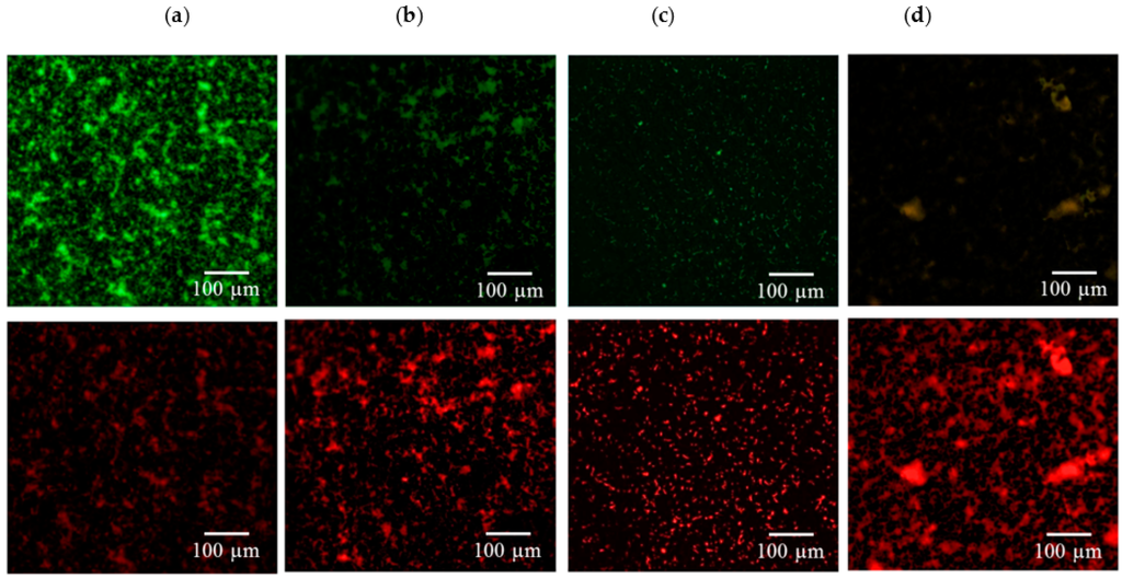 Viability staining of (a) E. coli exposed to (b) HOCl, (c) sodium hypochlorite (NaOCl), and (d) chlorhexidine (CHX). Viable bacteria are labeled green, and dead bacteria are labeled red. Fewer viable E. coli bacteria were found after treatment with the three irrigants.