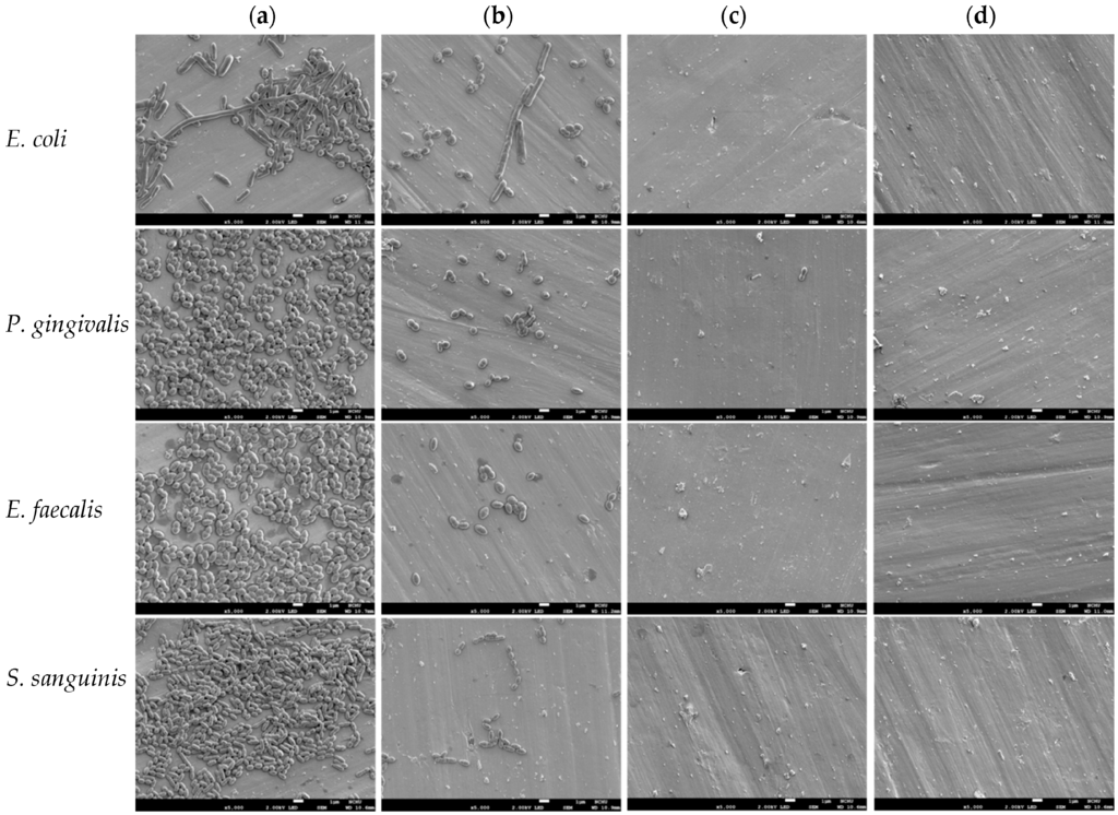 The use of dental implants to replace missing teeth has provided predictable and good long-term results [1,2,3,4]. However, the incidence of short- and long-term complications has increased. The two most common reasons for implant failure are overloading and infection. It is generally accepted that microbial biofilms play a significant role in the development of peri-implant diseases [5,6]. When the pristine surface of a dental implant is exposed to the oral cavity following installation, bacterial colonization takes places in a manner similar to that of teeth, which in turn gives rise to the development of mature biofilms [7,8]. Removal of the bacteria and their byproducts, such as LPS, has proven problematic [9] because of the screw-shaped design and surface microstructure of implants. Mechanical debridement alone is incapable of removing all biofilms. In addition, implants with rough surfaces and a large surface free energy tend to accumulate more plaque [10]. Infections are difficult to eliminate because the initial bacterial adhesion starts in areas of high wettability and inside the pits and grooves of the roughened surfaces [11]. Thus, the use of different chemotherapeutic agents has been proposed for the treatment of infected implant surfaces. To decrease the number of microorganisms to a level compatible with periodontal health, clinicians often use antimicrobial agents, such as CHX, NaOCl, citric acid, hydrogen peroxide, and tetracycline paste, as an adjunctive treatment to mechanical debridement [12,13,14]. However, satisfying therapeutic strategies or scientifically based treatment recommendations remain unavailable [14].
