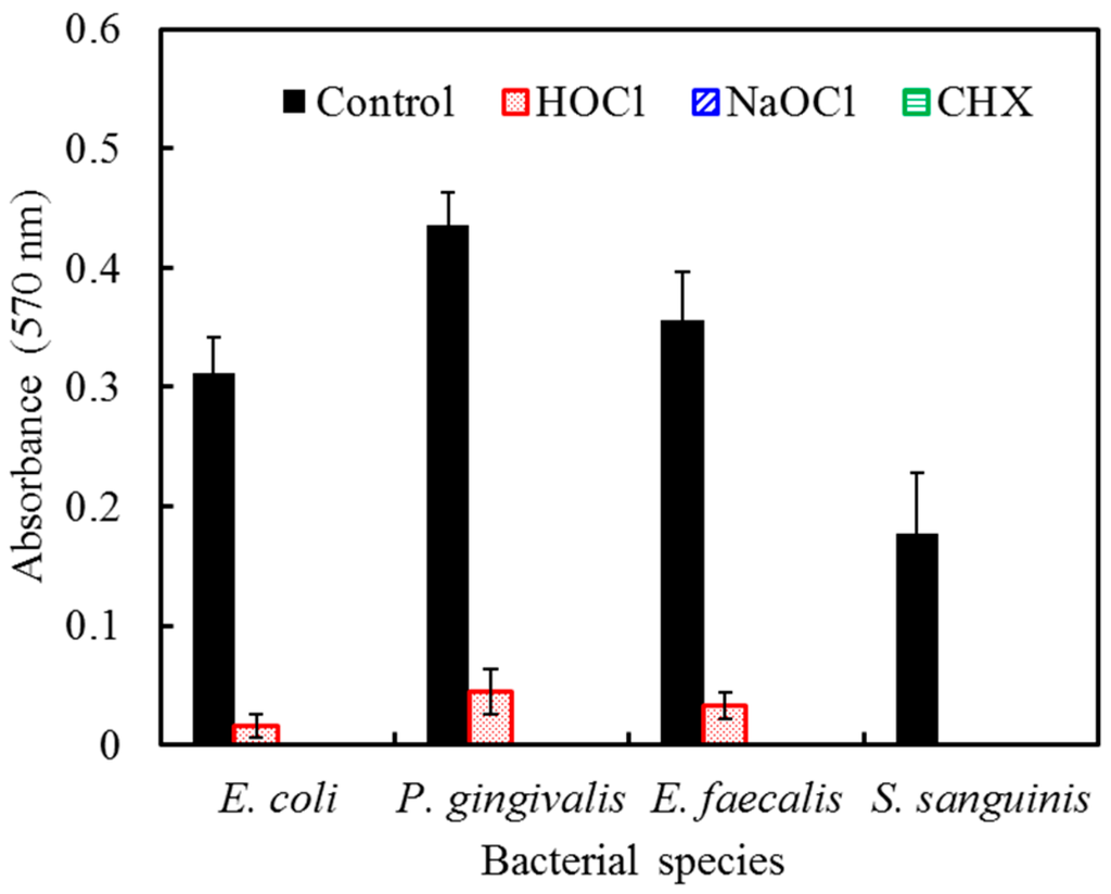 NaOCl has a broad spectrum of antimicrobial activity [25]. However, NaOCl may be harmful because it is extremely alkaline, irritating and cytotoxic at the concentrations typically used [25,27]. The antimicrobial activity of NaOCl is dependent on the concentration of un-dissociated HOCl in solution, and the hypochlorite ion (OCl−) is less effective than un-dissociated HOCl [25]. Indeed, commercial NaOCl solutions exhibit less antimicrobial potential than mildly acidic HOCl solutions within its effective antimicrobial concentration range [28]. Our results showed that HOCl failed to be equivalent to the efficacy of NaOCl and CHX at the same volume and exposure time. In fact, the used concentration of HOCl (0.018%) was much lower than those of NaOCl (1.3%) and CHX (0.2%) even if 4-fold volume was used. A 4:1 volume ratio of 180 ppm (0.018%) HOCl to bacterial solution completely killed all four of the bacterial strains. This level of antimicrobial efficacy was equivalent to the 1:1 volume ratio of 1.3% NaOCl and 0.2% CHX, although their absorbance below the detectable range. Our finding on the volume dependence of the antimicrobial activity of HOCl is consistent with a previous study [25]. According to the literature [24], the treatment time required to eliminate bacteria appreciably depends on the concentration (or volume) and type of irrigant used. A significantly higher concentration of the antiseptic and longer treatment time is required to completely kill bacteria [29].