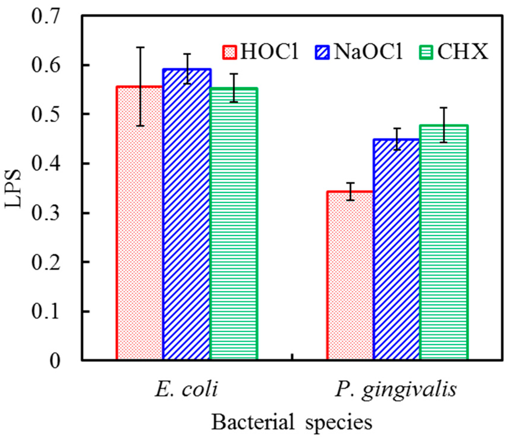 Residual lipopolysaccharide (LPS) levels from E. coli and P. gingivalis on titanium alloy surfaces after HOCl, NaOCl, and CHX treatment for 60 s. There was no significant difference in the residual LPS levels from E. coli. However, treatment with HOCl caused a significant decrease in the LPS from P. gingivalis when compared with NaOCl and CHX.