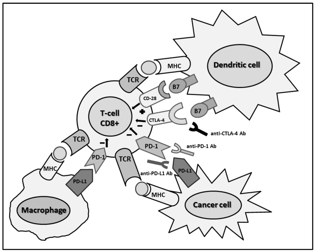 In the physiological immune response, after TAA recognition by CD4+ and CD8+ T cells, processed into small peptide and presented by antigen-presenting cells (APCs) through major histocompatibility complex (MHC) class II, two positive signals are required for activation. The first one is the connection between the T cell receptor (TCR) and MHC molecules; the second necessary step is the interaction between B7 on APCs and CD28 on T cells. The CD28 has a competitive receptor for B7 ligand, the cytotoxic T lymphocyte antigen-4 (CTLA-4), which delivers an inhibitory signal. While this negative feedback is mainly used in secondary lymphoid organ, other inhibitory pathways are present within the tumor microenvironment [17,18]. The most important peripheral regulatory pathway is the interaction between the programmed cell death-1 (PD-1) receptor, expressed on T cells, and the programmed cell death ligand-1 and 2 (PD-L1 and PD-L2) on the tumor cells surface.
