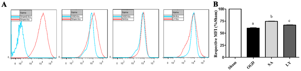 In order to investigate a possible cytoprotective effect of SA on OGD-induced mitochondria damage in astrocytes, we determined cell MMP by Rhodamine 123 (Rh 123) staining. As shown in Figure 2A, MMP was obviously decreased by OGD injury compared to the sham group (p ≤ 0.05). However, MMP in the SA group was higher compared to that in the OGD group (p ≤ 0.05). Interestingly, LY attenuated the neuroprotection induced by SA.